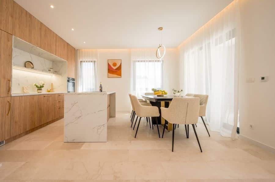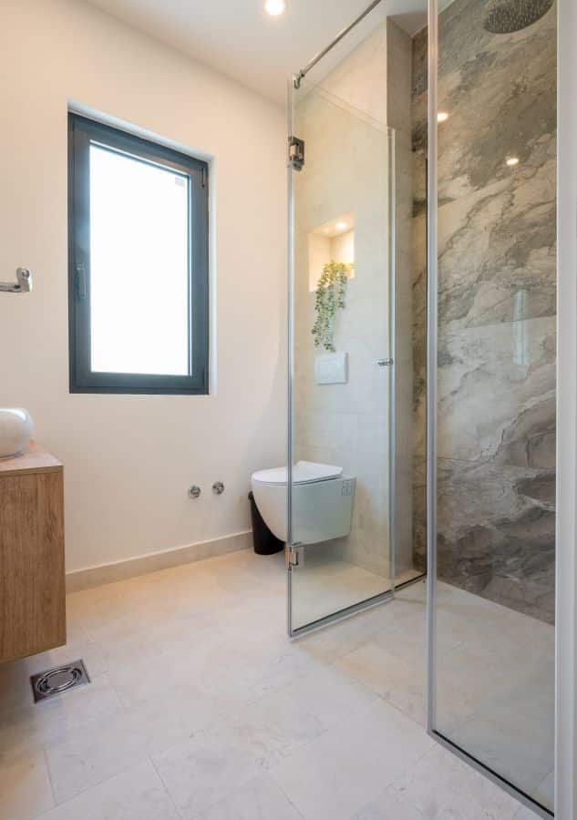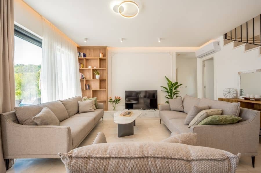 Die lichtdurchfluteten Wohnbereiche umfassen ein großzügiges Wohnzimmer mit Terrasse, eine moderne Küche mit Essbereich, vier Schlafzimmer mit Meerblick sowie vier hochwertig ausgestattete Badezimmer. Die Villa ist mit Fußbodenheizung, Klimaanlage, maßgefertigten Möbeln und einer Garage für zwei Fahrzeuge ausgestattet. Der Infinity-Pool und die moderne Architektur schaffen ein exklusives Wohnambiente.