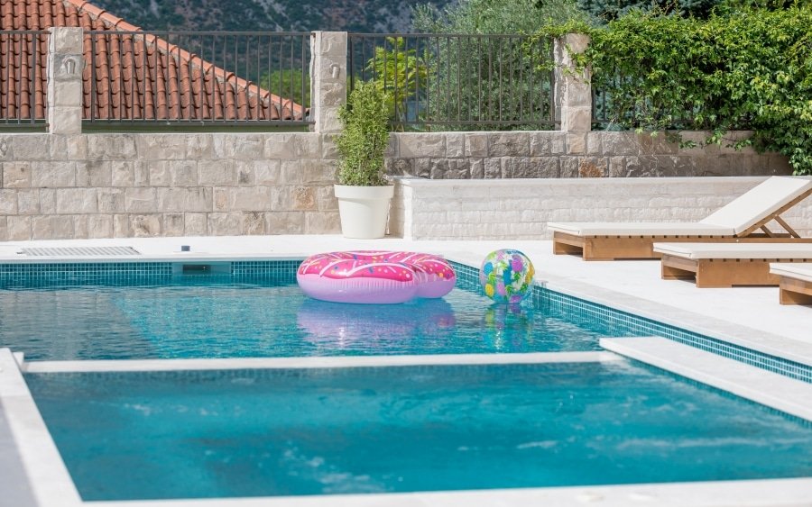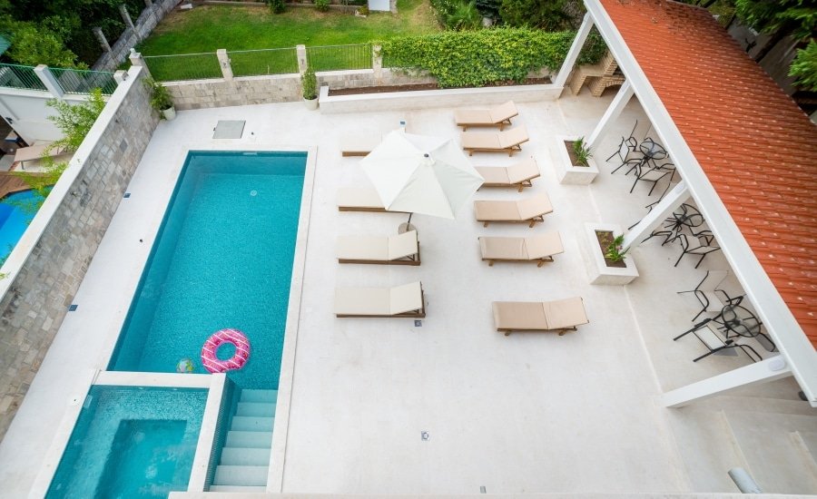 Über drei Etagen erstrecken sich sechs Schlafzimmer, fünf Badezimmer, ein großzügiger Wohnbereich mit Esszimmer und Küche sowie insgesamt sechs Terrassen. Der Außenbereich umfasst einen gepflegten Garten, einen Pool mit 6,7 x 3,6 Metern sowie einen Jacuzzi. Darüber hinaus gehören eine Garage und zusätzliche Parkmöglichkeiten für mehrere Fahrzeuge zur Ausstattung. Bereits ab dem ersten Obergeschoss eröffnet sich ein unverbaubarer Blick auf das Meer und die Bucht von Kotor. Die Villa ist vollständig möbliert und mit Klimaanlage, Zentralheizung, Kamin, Natursteinböden, Eichenparkett, Kabel-TV und Internet ausgestattet.